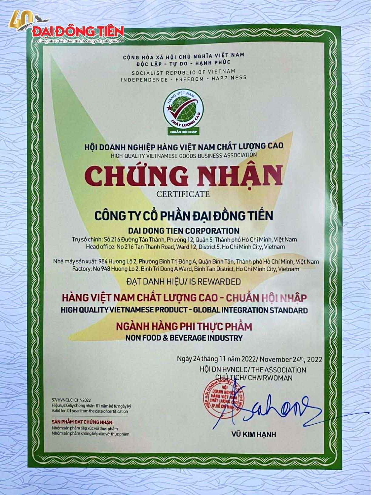 Vào ngày 24/11/2022 Công Ty Cổ Phần Đại Đồng Tiến đã vinh dự đạt chứng nhận Hàng Việt Nam Chất Lượng Cao Chuẩn Hội Nhập do người tiêu dùng bình chọn.